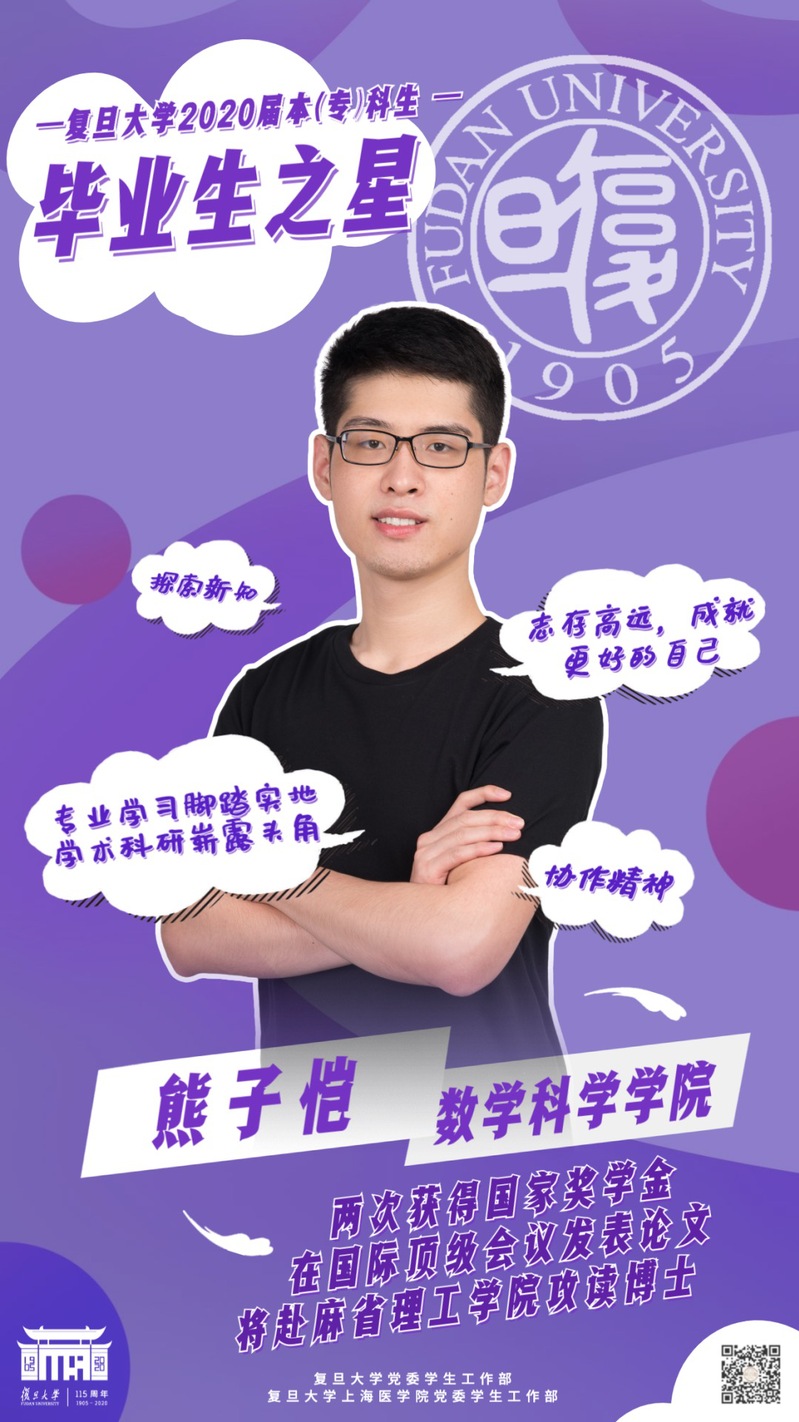 Every year, Fudan announces ten winners of the “Graduation Star” title, the highest honor a Fudan undergraduate can earn. It is presented to the best students who are going to graduate from the university with a bachelor’s degree that year. The winners should demonstrate academic and research excellence as well as valuable qualities including diligence, perseverance, kindness, courage, enterprise, etc.