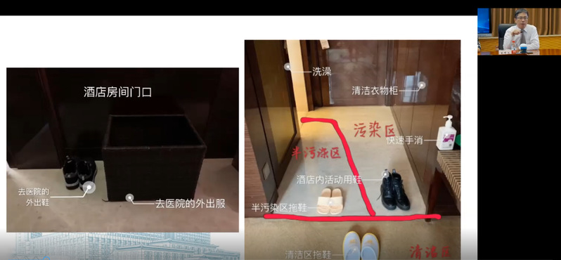 Zhu took photos of the articles he used in the hotel when he was in Wuhan and explained that he put shoes and jackets outside the hotel room door and divided the area just inside the hotel room door into three parts to keep the living space virus-free.