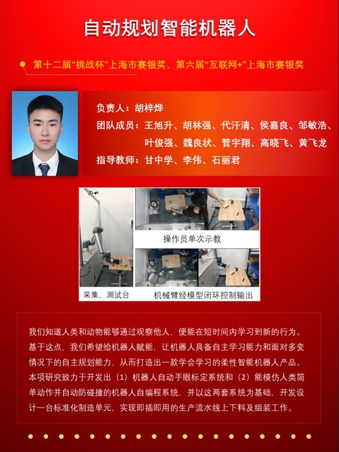 | 3 | 复旦校内赛一等奖 | 自动规划智能机器人 | 胡梓烨 | 甘中学、李伟、石丽君 | 王旭升、胡林强、代汗清、侯嘉良、邹敏浩、叶俊强、魏良状、管宇翔、高晓飞、黄飞龙 |