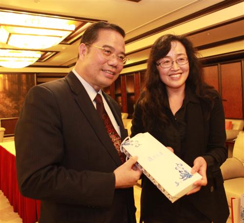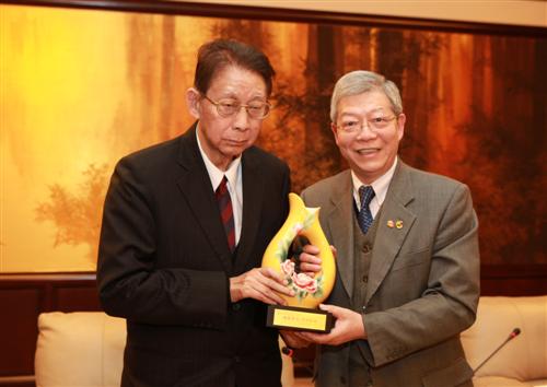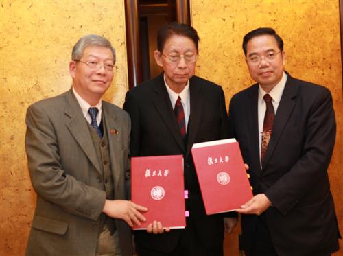 2012年11月20日,中国文化大学张镜湖董事长与吴万益校长率团一行30余人访问我校。此次是中国文化大学第一次来访复旦,主要就两校在学生学术交流方面的工作开展进行了协商,并在光华楼金厅举行了两校缔结姐妹校的签约仪式,杨玉良校长出席并与吴万益校长共同签署了《学生交换协议》和《学术交流与合作协议》。参与当天接待的还有史地所吴松弟所长、法学院王志强副院长、环科系杨新副系主任以及教务处徐雷处长、总务处栗建华处长、档案馆周桂发馆长、外事处刘莉副处长、学工部徐阳副部长。