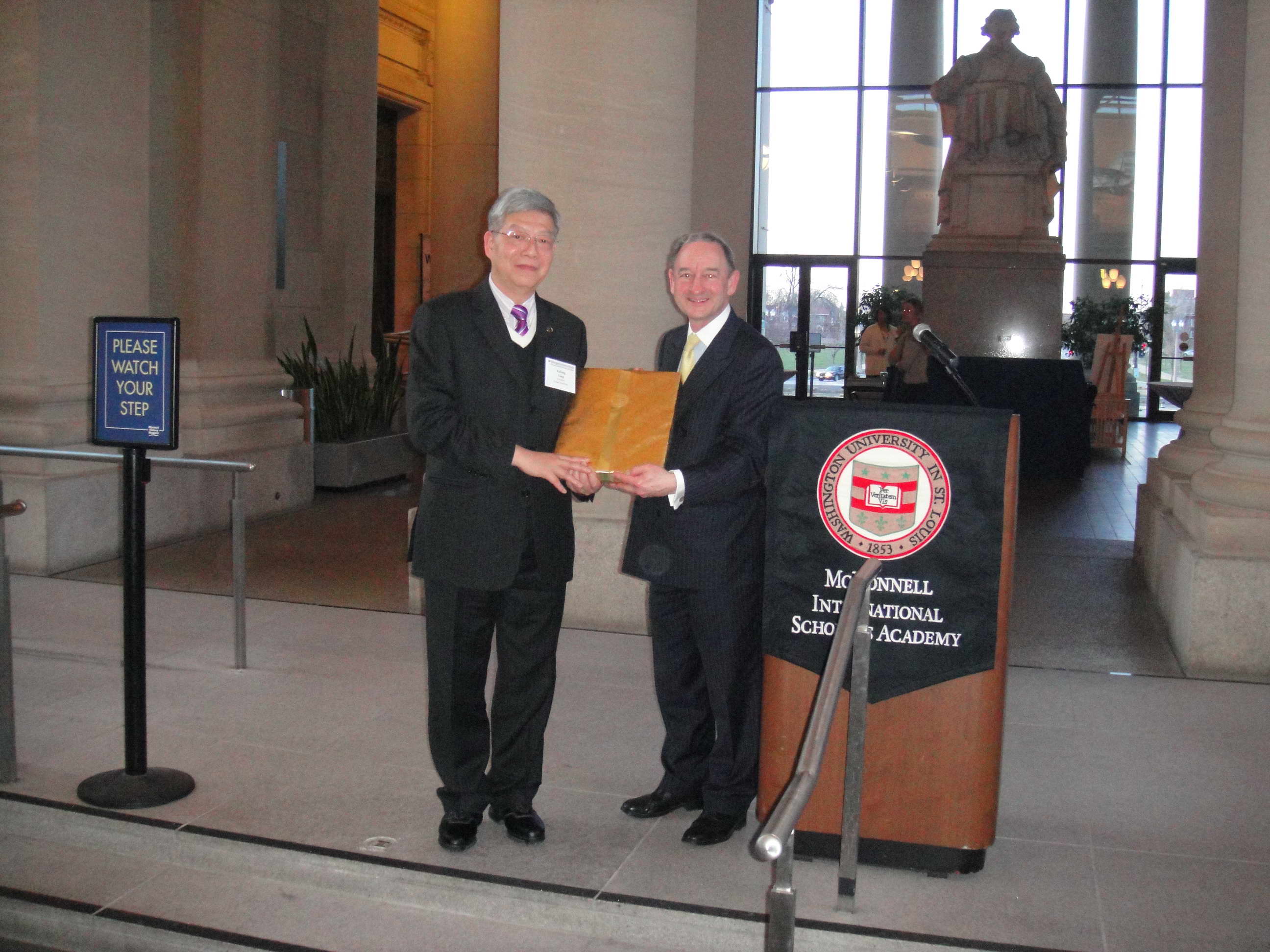 4月2日,WUStL的校长Wrighton在密苏里历史博物馆设宴感谢杨玉良校长在ST Lee系列演讲活动中担任演讲嘉宾