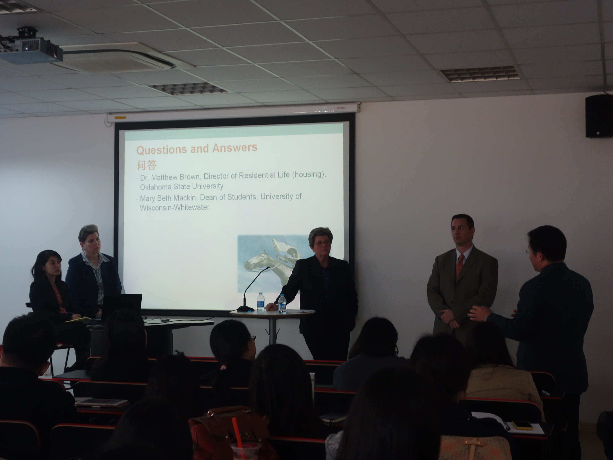 会后,Bird校长做了一场关于“学生发展理论和实践”的精彩讲座,有40多位学工、研工部的老师们前来参与。大家开展了积极的互动问答,就很多学生管理、危机处理、心理咨询等方面的问题进行了深入探讨和经验分享。