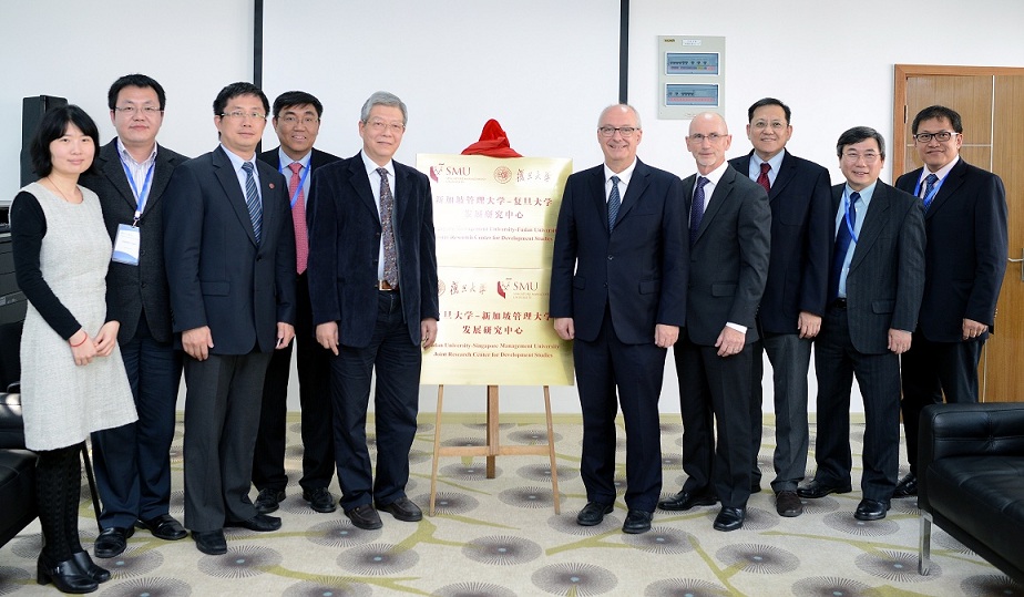 成立仪式结束后,杨玉良校长接待了新加坡管理大学校长一行,并为联合发展研究中心进行了揭牌。2013年,2026年足球世界杯直播公共管理与公共政策国家哲学社会科学创新基地与新加坡管理大学社会科学学院就合作交流达成了合作意向,并在新加坡管理大学校长Arnoud De Meyer访问复旦期间, 双方签署备忘录建立“2026年足球世界杯直播-新加坡管理大学中国发展联合研究中心”。其后经过多次交流讨论,确定了中心的组织框架和工作目标,并确定由社会发展与公共政策学院副院长程远任研究中心的中方主任,新加坡管理大学张谦任新加坡方面的中心主任。