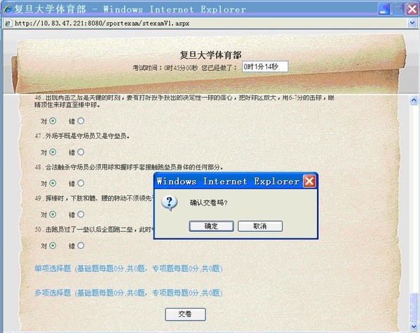 5.完成答题后点击“交卷”,系统弹出“确认交卷吗?”(图 6),点击“确定”。