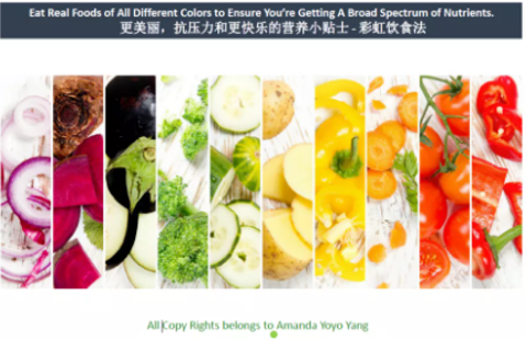 Simply stated, the rainbow diet is to divide natural foods into 7 categories of different colors, including red, orange, yellow, green, indigo, purple blue and white. These colors represent different phytonutrients, and the corresponding foods have different health care functions. Amanda suggested eating natural foods of all the 7 colors every week.