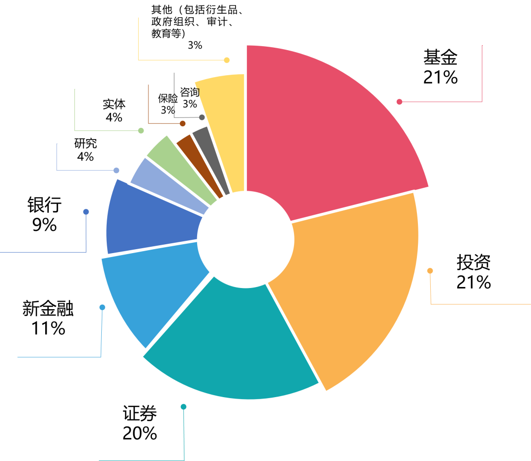 Fund 21%;Investment 21%;Securities 20%;New finance 11%;Bank 9%;Research 4%;Entity 4%;Insurance 3%;Consultancy 3%;Others (including derivatives, government organizations, auditing, education etc.) 3%