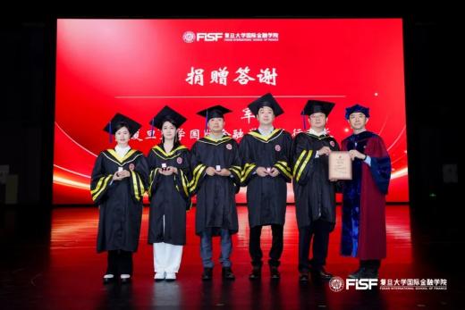 ▲Jun Qian, Executive Dean of FISF and Professor in Finance, granting the “Xianghui Alumni Seal” and Donation Certificates to graduate representatives in appreciation of their donations