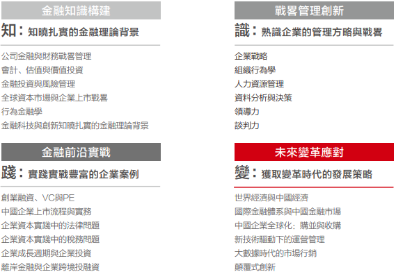FISF FEMBA培養體系中金融相關課程占80%,聚焦與實業深度相關的金融知識系統。