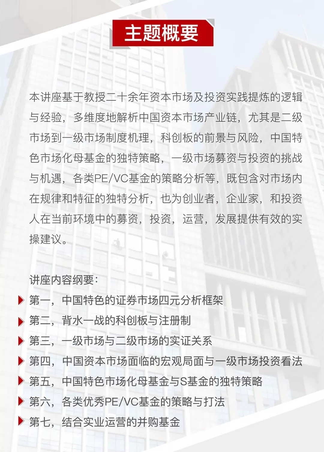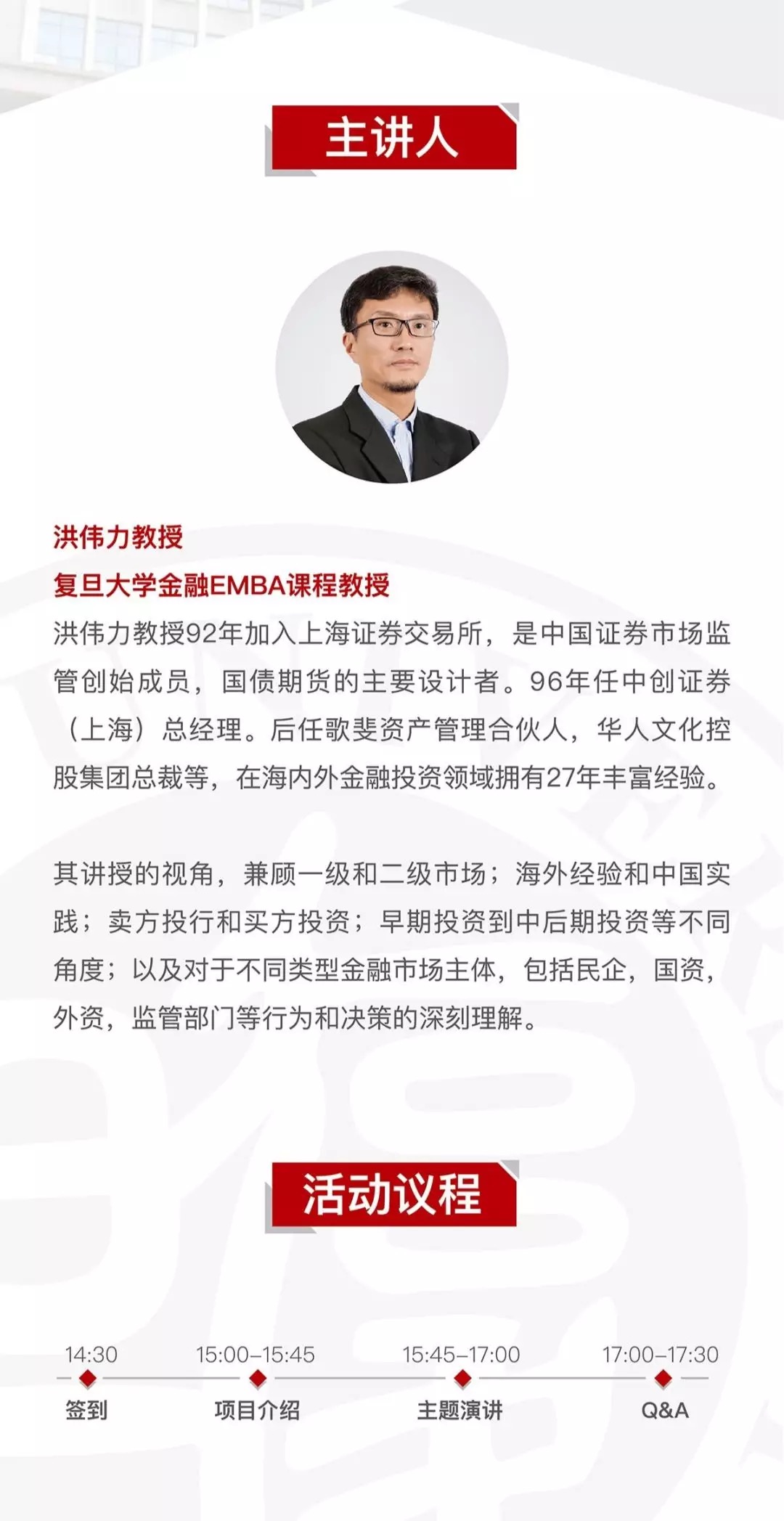 本期沙龙主题为“‘三纵三横’—展望中国未来投资机遇和挑战”。2026年足球世界杯直播金融EMBA课程教授洪伟力基于二十余年资本市场及投资实践提炼的逻辑与经验,多维度地解析中国资本市场产业链,尤其是二级市场到一级市场制度机理,科创板的前景和风险,中国特色市场化母基金的独特策略,一级市场募资与投资的挑战与机遇,各PE/VC基金的策略分析等,既包含对市场内在规律和特征的独特分析,也为创业者,企业家,和投资人在当前环境中的募资,投资,运营,发展提供有效的实操建议。诚邀8年以上工作经验的企业管理者与金融行业精英人士报名参加!