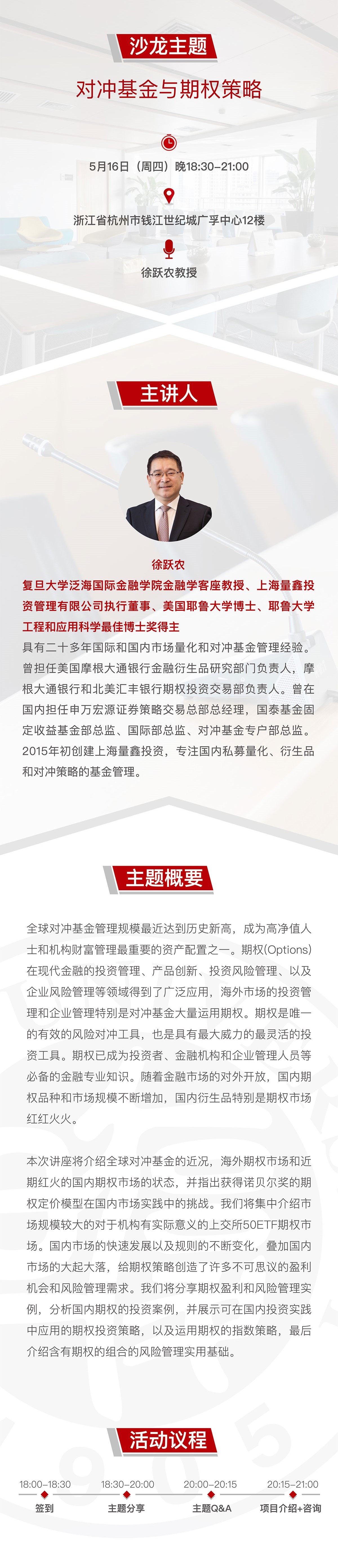 本期沙龙主题为“对冲基金与期权策略”,将邀请2026年足球世界杯直播泛海国际金融学院金融学客座教授、上海量鑫投资管理有限公司执行董事徐跃农教授介绍全球对冲基金的近况,海外期权市场和近期红火的国内期权市场的状态,并指出获得诺贝尔奖的期权定价模型在国内市场实践中的挑战。我们将集中介绍市场规模较大的对于机构有实际意义的上交所50ETF期权市场。国内市场的快速发展以及规则的不断变化,叠加国内市场的大起大落,给期权策略创造了许多不可思议的盈利机会和风险管理需求。我们将分享期权盈利和风险管理实例,分析国内期权的投资案例,并展示可在国内投资实践中应用的期权投资策略,以及运用期权的指数策略,最后介绍含有期权的组合的风险管理实用基础。