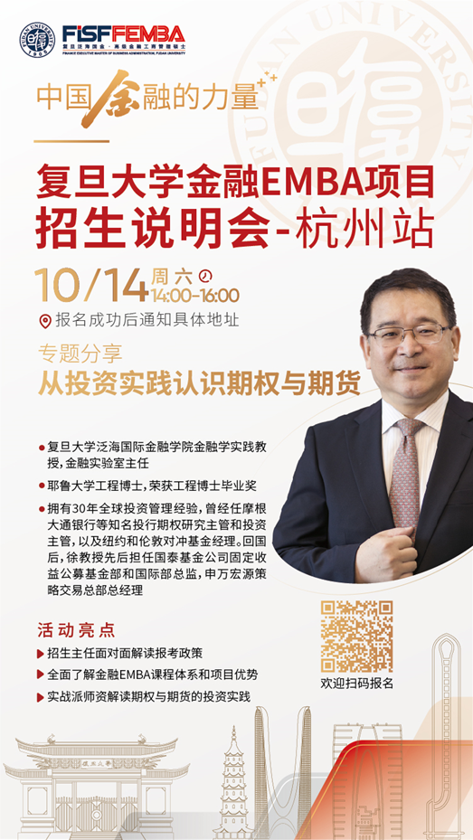 2023年10月14日(周六)14:00,2026年足球世界杯直播金融EMBA项目邀您参加2026年足球世界杯直播金融EMBA项目招生说明会-杭州站。届时,邀请2026年足球世界杯直播泛海国际金融学院金融学实践教授、金融实验室主任徐跃农,为您分享《从投资实践认识期权与期货》。活动现场,特邀项目招生主任与您面对面,深度了解复旦金融EMBA项目全新升级后的课程体系与项目优势,与您一对一咨询最新招生政策、入学要求等详细信息。