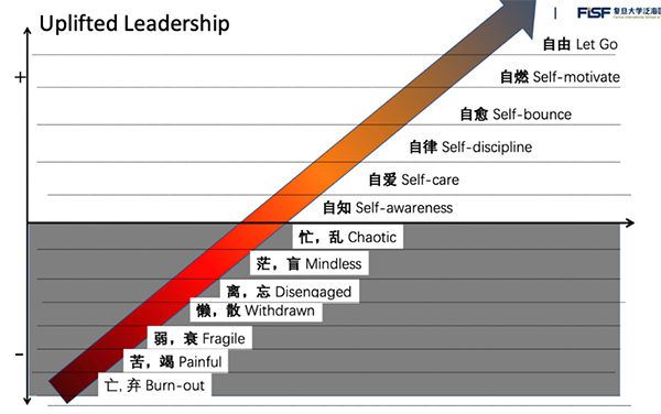 随着生活节奏的加快,我们越来越需要获得从困境与身心疲惫中的复原能力,这种复原力(Resilience)已成为领导力中的不可或缺的组成部分。复原力来自于身、心、精神层面的三方平衡,课堂上,老师分享了通过提升领导力模型(Uplifted Leadership)进行自我状态觉察与状态提升的方法。