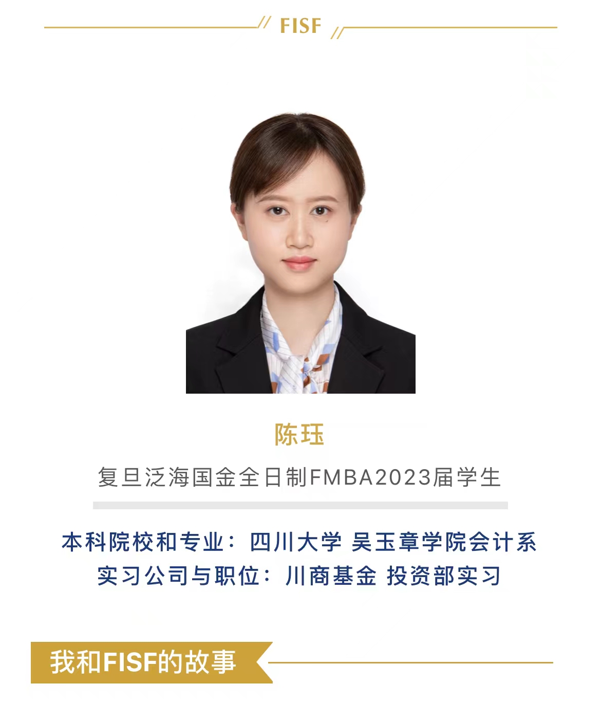 我本科就读于四川大学吴玉章学院会计学专业,毕业时选择了会计系学生最稳妥的发展路径——加入四大会计师事务所从事审计的工作。在工作近三年后,我发现四大出身的人经历同质化严重,无法进行差异化竞争,因此决定通过读研究生项目提高自己的竞争力。选择复旦泛海国金的全日制金融MBA项目主要原因是看中这里的平台和同学:学院认真关注同学们的需求;同学们来自于不同背景、有着丰富工作经验,大家在一起学习时有很多共同语言,可以互相切磋、取长补短、携手追逐梦想。