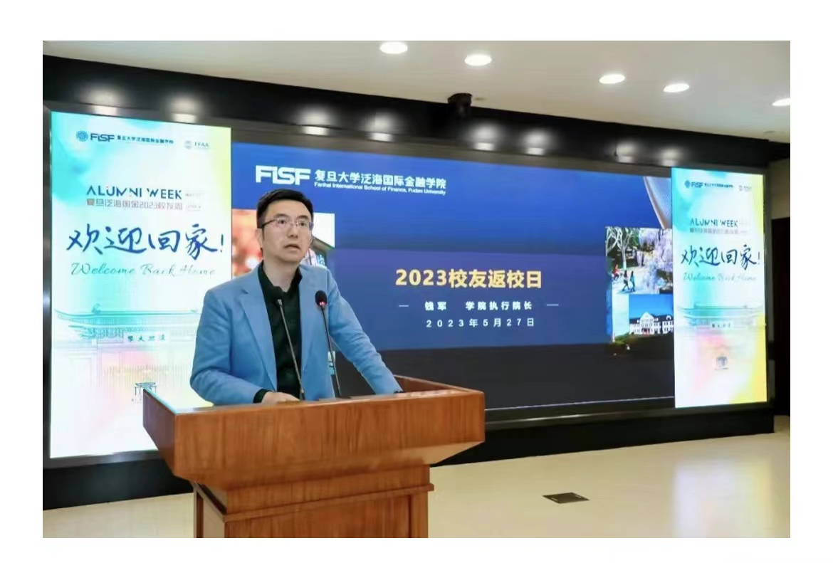 复旦泛海国金执行院长、学院校友会会长、金融学教授钱军做第二届校友周开幕暨2023年度校友返校大会欢迎致辞,介绍学院新发展,欢迎校友们“回家”。