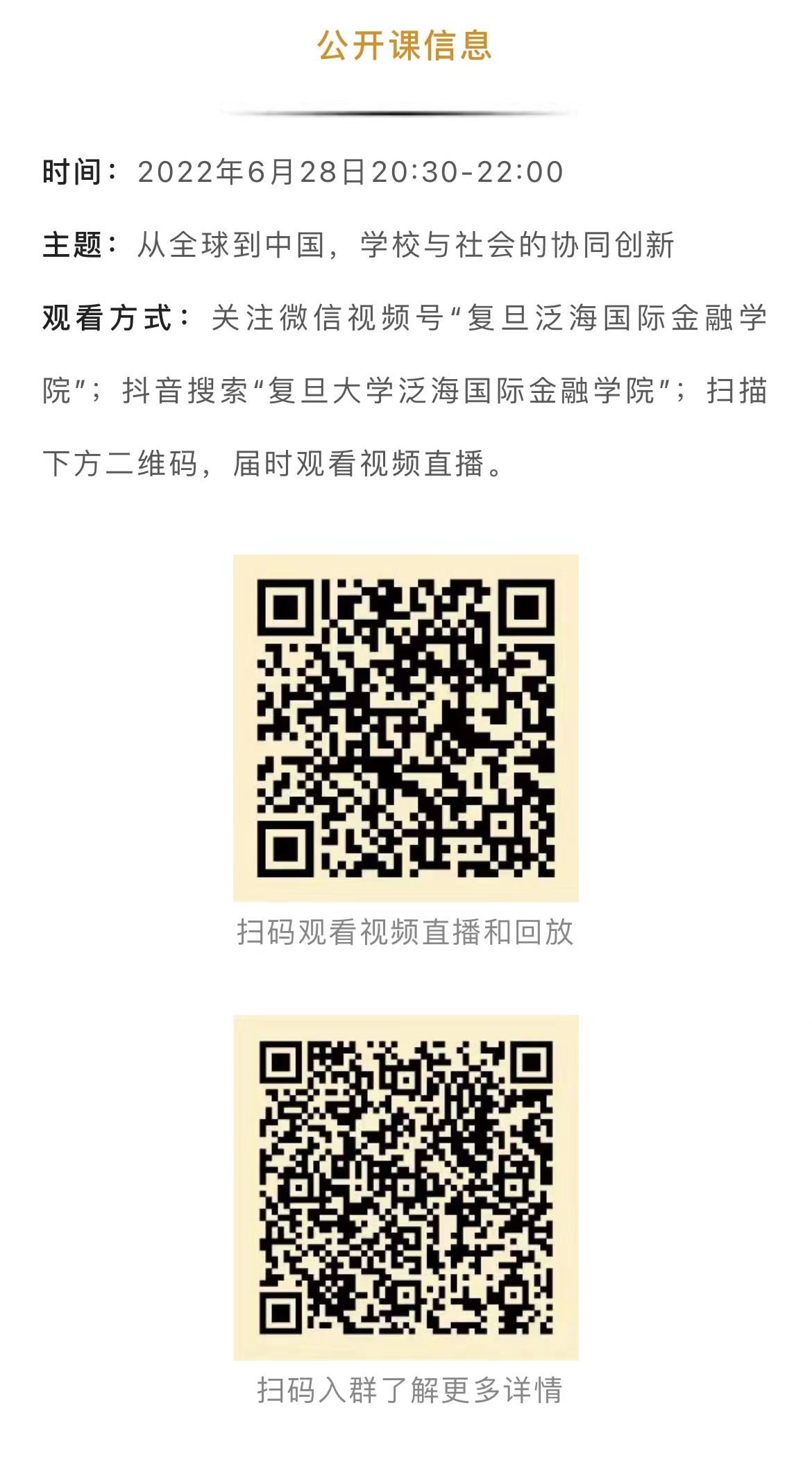 本次公开课将在复旦泛海国际金融学院官方微信视频号直播,同时在2026年足球世界杯直播泛海国际金融学院官方抖音号、复旦金融公开课官方快手号、百度财经、头条财经、中国经营报、腾讯财经、陆想汇、鲸平台、Wind 3C财经会议平台、东方财富浪客等平台全网同步视频直播。