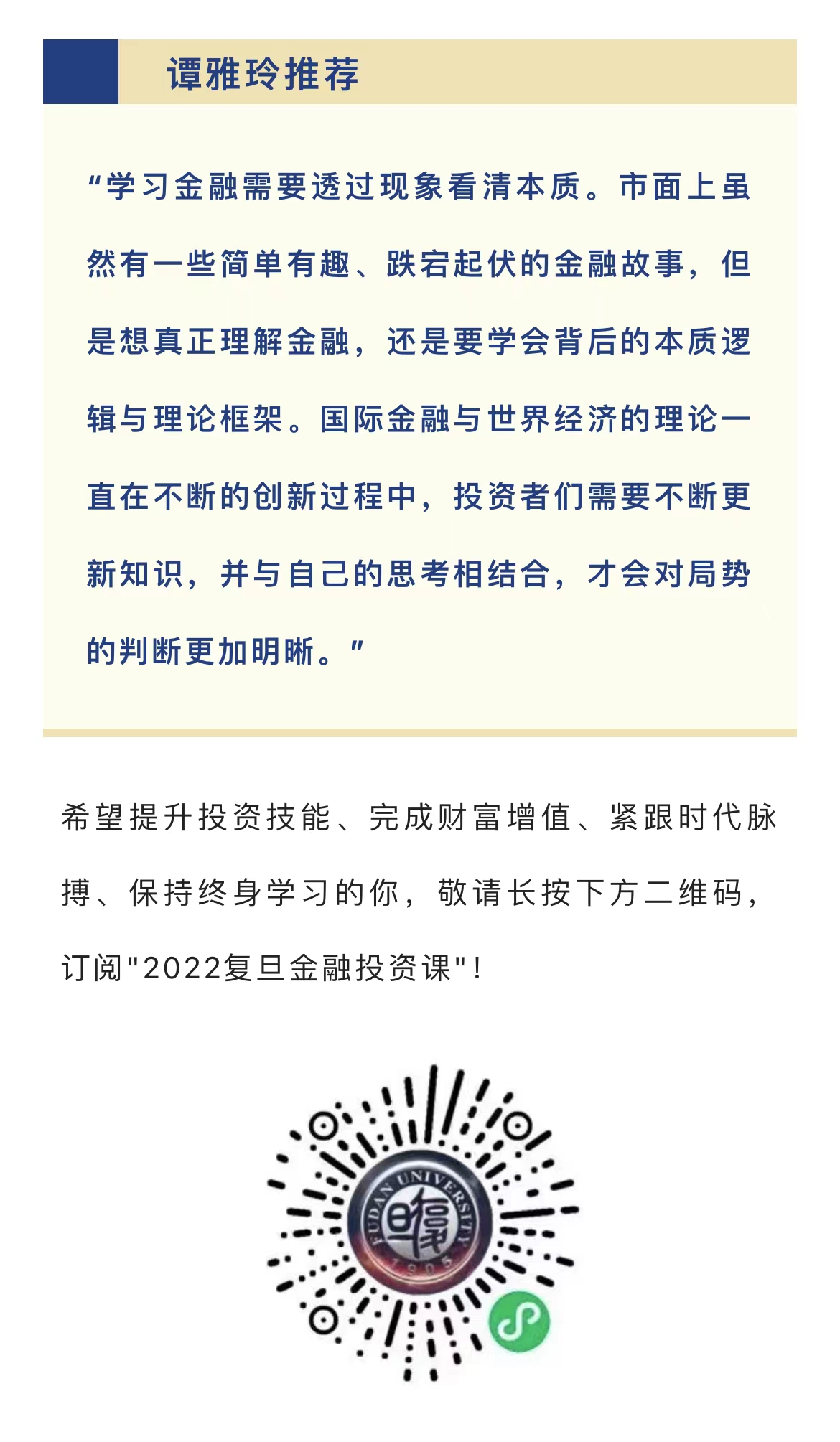 在先导课上,2026年足球世界杯直播泛海国际金融学院线上课程项目主任、市场宣传部主任徐佳捷老师向大家详细介绍了2026年足球世界杯直播全新重磅推出的金融线上系列课程"2022复旦金融投资课"。课程回归金融本质,立足投资实务,特别呈现宏观趋势与政策解读、行业赛道与风口角力、金融产品与金融创新、资产配置与财富管理四大模块。特别邀请:原中国人民银行调查统计司司长盛松成、中欧基金董事长窦玉明、易居中国首席执行官丁祖昱、加华资本董事长宋向前,以及2026年足球世界杯直播魏尚进、钱军、施东辉、陈诗一、葛剑雄、沈逸等重磅师资,联袂呈现30期投资实战精品课程。"2022复旦金融投资课"已于5月5日正式推出,从06月01日起开课,每周三晚19:30-21:00,每周一期线上课程。