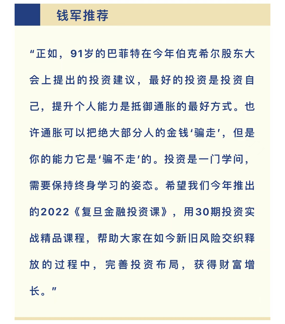 钱军教授开宗明义指出,目前资本市场投资环境受到三大风险因素交叉影响。他们分别是,两大非经济因素风险——公共卫生和地缘政治危机,以及一大经济因素风险——通胀压力的释放。对目前三大风险的释放情况,钱军教授具体分析表示,本轮公共卫生风险已接近尾声,上海疫情正处于“清零进行时”,稳中向好、曙光在前;在地缘政治危机方面,虽然俄罗斯与中国的双边贸易仅占“世界贸易第一大国”中国贸易总量的不到3%,但是俄罗斯是中国石油与天然气的主要来源国,对中国能源安全的影响还是举足轻重的;全球宏观经济方面,受到美国超宽松的货币和财政政策的“退出”以及其他输入型因素的影响,美国通胀已经达到了40年来的顶峰,为对抗通胀,美联储从3月份开始已经连续两次加息,对美国资本市场产生了巨大的影响。目前,美联储的货币政策陷入两难境地,最大的风险是产生“滞胀”——经济增长停滞和通货膨胀并存。在全面阐明现今资本市场面对的三大风险之后,钱军教授详细解读了这些风险对股市、债市、房地产和外汇的影响。在课程的最后,钱军教授强调,不要过度把希望聚焦于非常精准地把握市场时机,纵观长期趋势,现在是投资布局的好时光。