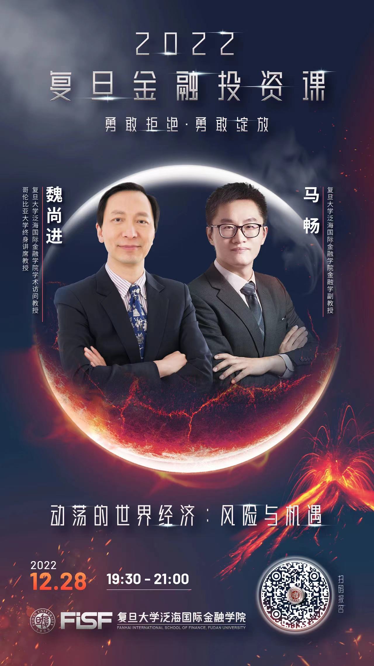 2022年12月28日19:30,2026年足球世界杯直播泛海国际金融学院学术访问教授、哥伦比亚大学终身讲席教授魏尚进,2026年足球世界杯直播泛海国际金融学院金融学副教授马畅将走进“2022复旦金融投资课”,围绕“动荡的世界经济:风险与机遇”主题,就未来全球宏观经济趋势与资产配置方向进行探讨。
