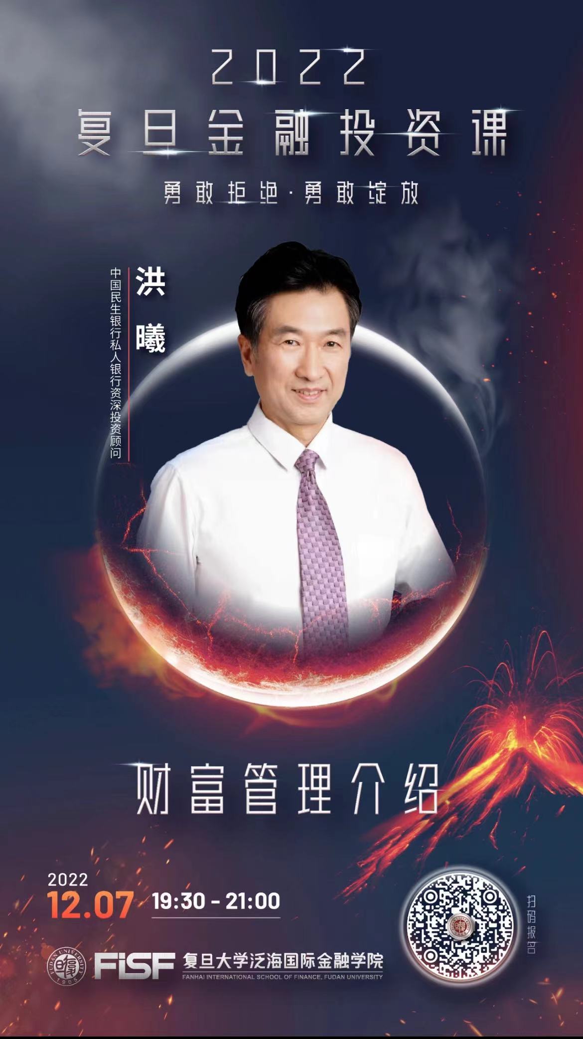 2022年12月7日19:30,中国民生银行私人银行资深投资顾问洪曦将走进“2022复旦金融投资课”,围绕“财富管理介绍”主题,从财富管理的行业生态、职业路径选择、资产管理理论等多个维度,深入开展课程论述。