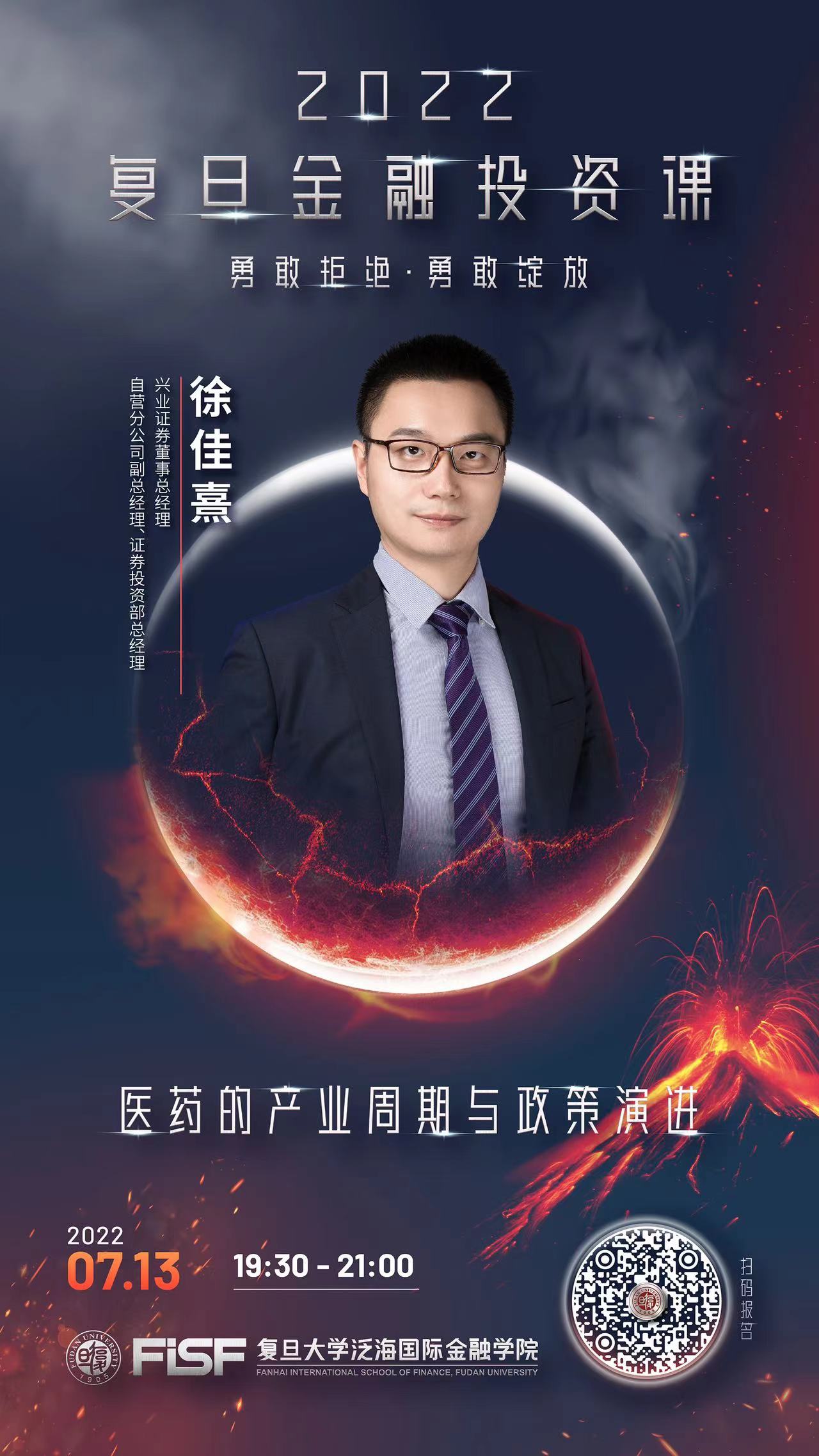 2022年7月13日19:30,兴业证券董事总经理、自营分公司副总经理、证券投资部总经理徐佳熹,将走进“2022复旦金融投资课”,围绕“医药的产业周期与政策演进”主题,从中国医药行业的长周期与短周期驱动因素、新医改下的挑战和机遇切入,全面阐述如何把握需求升级下的消费红利,以及供给升级下的创新红利和工程师红利,并对新一轮医药大行情下的行业机遇、个股走势给出具体投资建议。