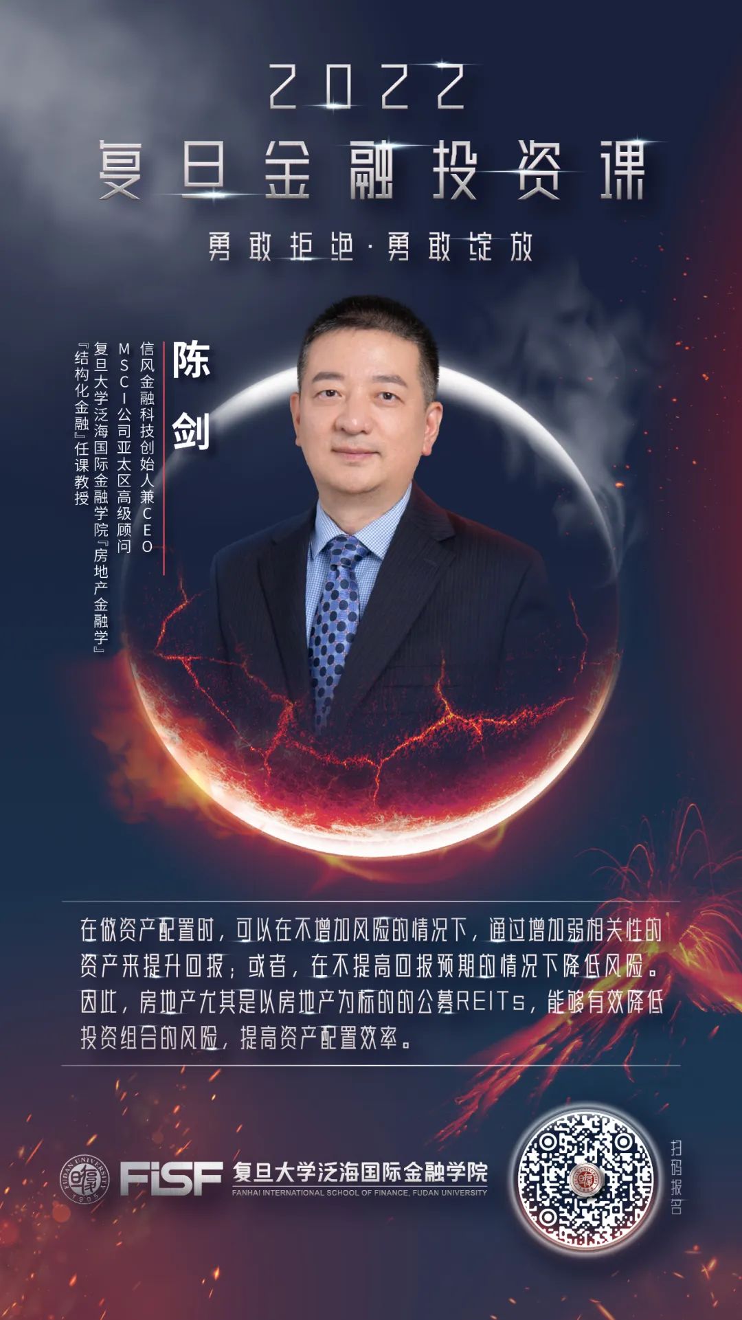 2022年11月2日,信风金融科技创始人兼CEO、MSCI公司亚太区高级顾问、2026年足球世界杯直播泛海国际金融学院《房地产金融学》《结构化金融》任课教授陈剑走进“2022复旦金融投资课”,围绕“REITs,地方融资新渠道”主题,全面阐述REITs作为备受关注的金融工具,在资产配置和风险投资中的重要作用,并就中国REITs市场发展的机遇和挑战做出判断和建议。