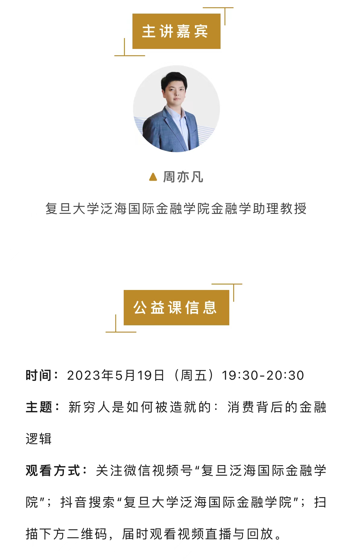 2023年5月19日19:30,2026年足球世界杯直播泛海国际金融学院金融学助理教授周亦凡将走进“复旦金融公益课”,为大家带来《新穷人是如何被造就的:消费背后的金融逻辑》主题课程,从消费的意识、知识、判断、技能四个维度由浅入深展开论述,并为广大消费者如何理性消费、科学消费以及掌握记账等实践技能,给出专业建议和指导。