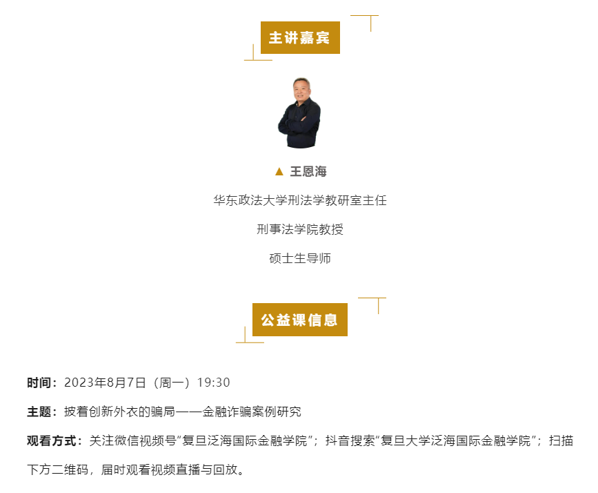2023年8月7日19:30,华东政法大学刑法学教研室主任、刑事法学院教授、硕士生导师王恩海将走进“复旦金融公益课”,为大家带来《披着创新外衣的骗局:金融诈骗案例研究》主题课程。王恩海教授将从最常见的经济犯罪类型、防范经济犯罪所需要的意识、知识、技能等方面切入,深入浅出地分析、梳理、认识相关法条,从根源上剖析经济犯罪的危害,以及如何有效防范经济犯罪。