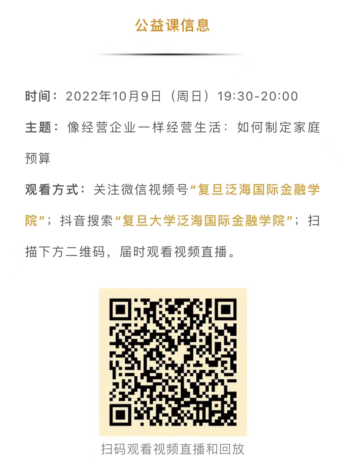 2022年10月9日19:30,加拿大阿尔伯塔大学商学院副教授、深圳丰泰居科技有限公司董事长、异乡好居科技有限公司董事朱国钟将走进“复旦金融公益课”,为大家带来《像经营企业一样经营生活:如何制定家庭预算》主题课程,全面分析预算打通家庭、公司经营的关键路径,家庭、企业预算不同管理阶段的核心要义,以及组织推动预算执行的分配机制等问题。