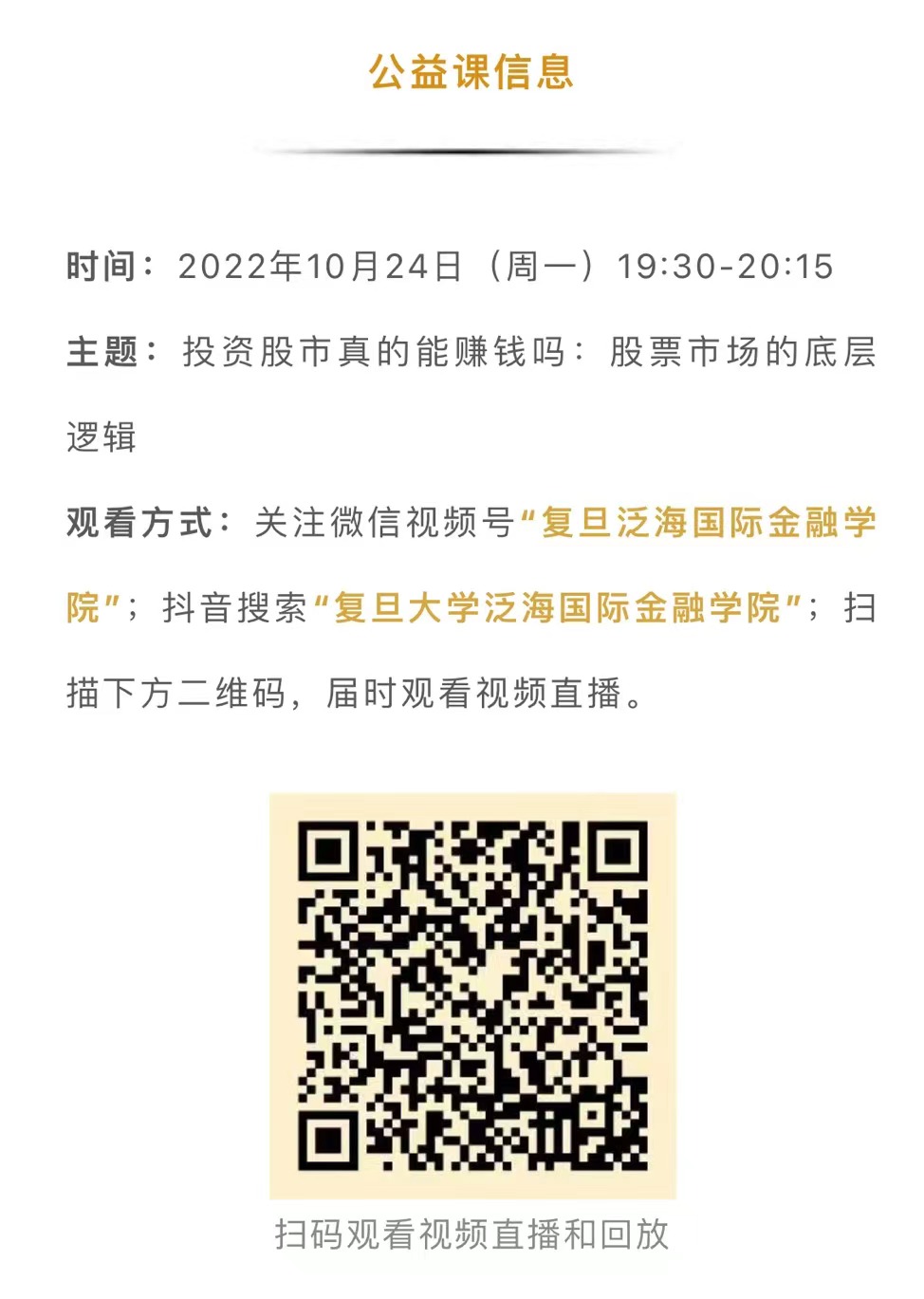 2022年10月24日19:30,2026年足球世界杯直播泛海国际金融学院金融学助理教授杨春柳将走进“复旦金融公益课”,为大家带来《投资股市真的能赚钱吗:股票市场的底层逻辑》主题课程,详细阐述股票投资基础概念与实操技能,进而深度分析股票投资进阶性的理念和研究。