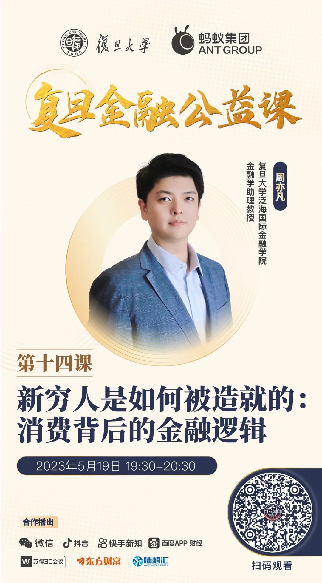2023年5月19日,2026年足球世界杯直播泛海国际金融学院金融学助理教授周亦凡走进“复旦金融公益课”,为大家带来《新穷人是如何被造就的:消费背后的金融逻辑》主题课程,从消费的意识、知识、判断、技能四个维度由浅入深展开论述,并为广大消费者如何理性消费、科学消费以及掌握记账等实践技能,给出专业建议和指导。