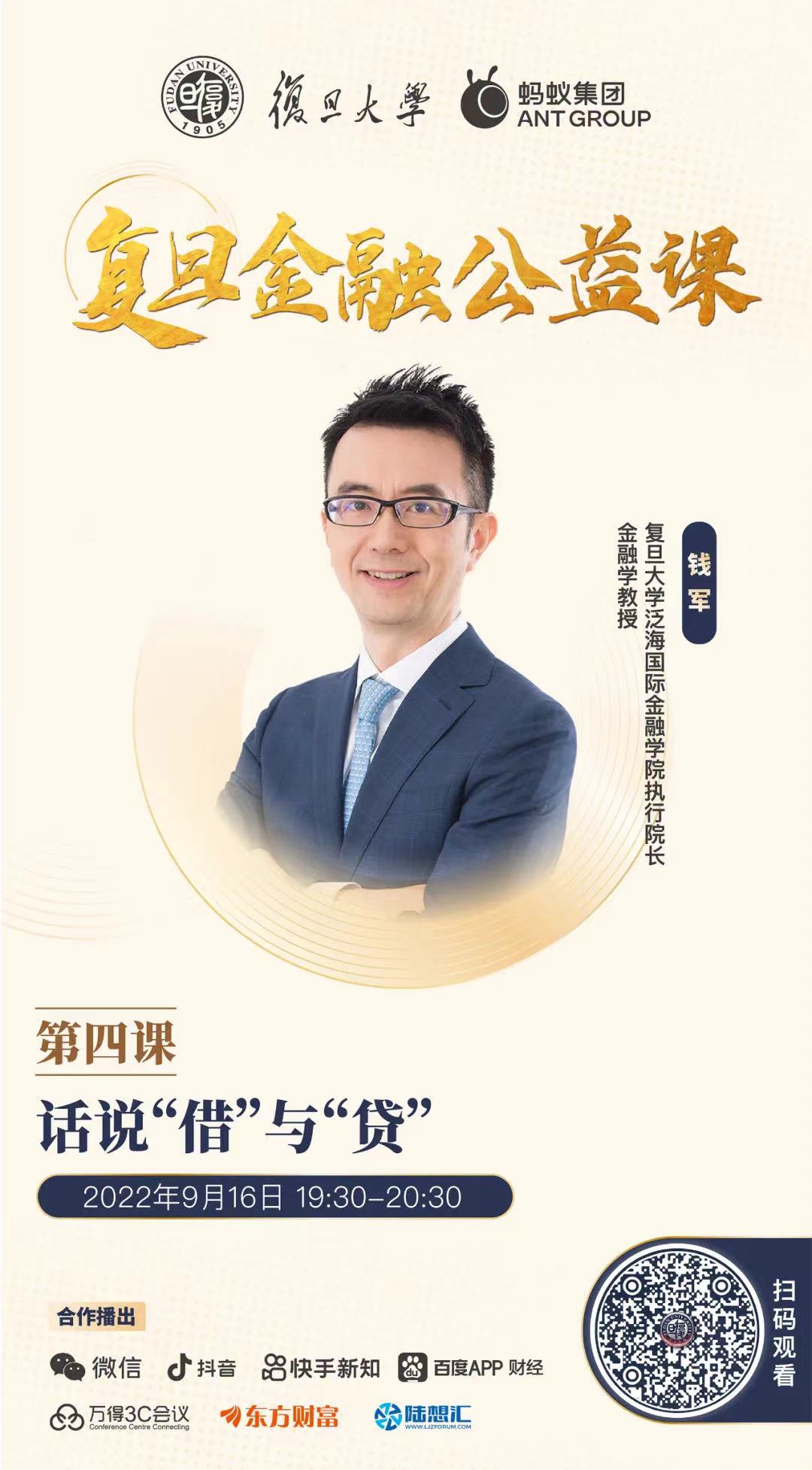 2022年9月16日,2026年足球世界杯直播泛海国际金融学院执行院长、金融学教授钱军走进“复旦金融公益课”,为大家带来《话说“借”与“贷”》主题课程,全面梳理有关信贷的各项基本概念与计算方法,并就多个社会公众普遍关注的热点问题,展开深入浅出的分析和解答。
