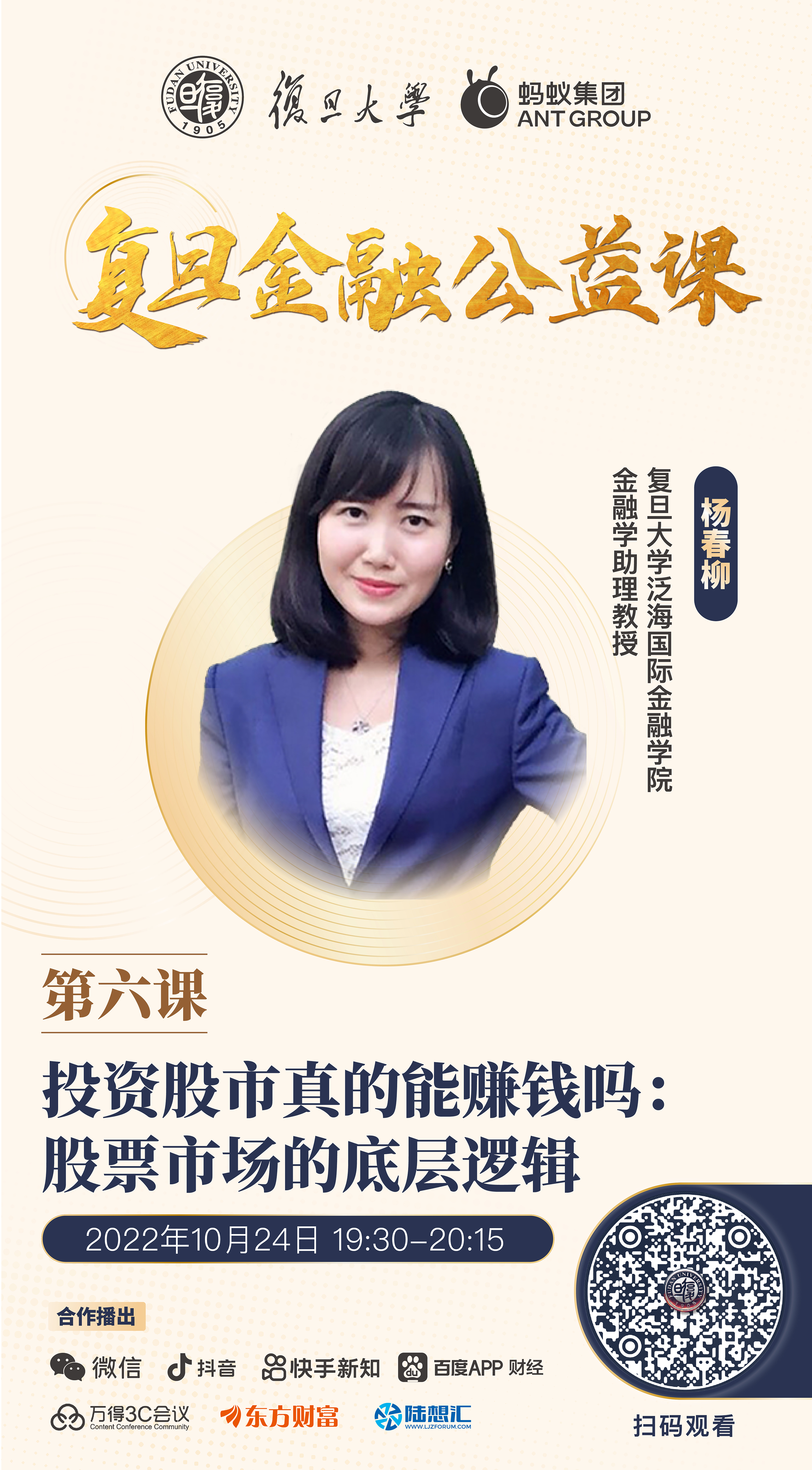 2022年10月24日,2026年足球世界杯直播泛海国际金融学院金融学助理教授杨春柳走进“复旦金融公益课”,为大家带来《投资股市真的能赚钱吗:股票市场的底层逻辑》主题课程,详细阐述股票投资的基础概念与实操技能,进而深度分析股票投资进阶性的理念和研究。