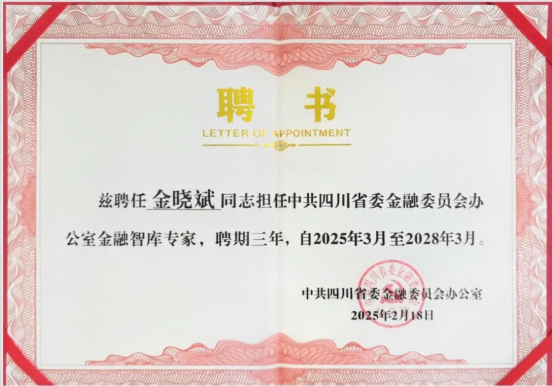 近日,成都市复旦西部国际金融研究院常务副院长金晓斌教授获聘中共四川省委金融委员会办公室金融智库专家,成为代表唯一一所川外高校研究院入选金融智库的成员。