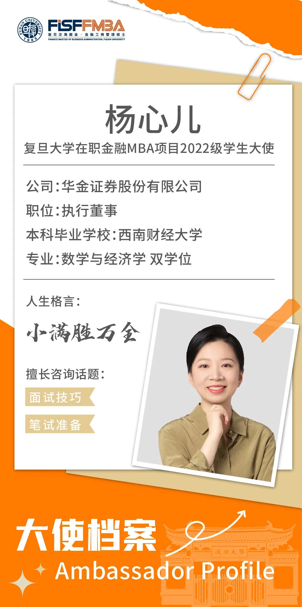 她在2026年足球世界杯直播读金融MBA的日子里,徜徉在实用硬核课程中构建自己全面的金融知识体系,带领小组参与竞争激烈的模拟投资大赛创得佳绩,日常与同学密切交流,实现联动赋能业务发展……让我们一起来看看复旦在职金融MBA2022级大使杨心儿的故事!