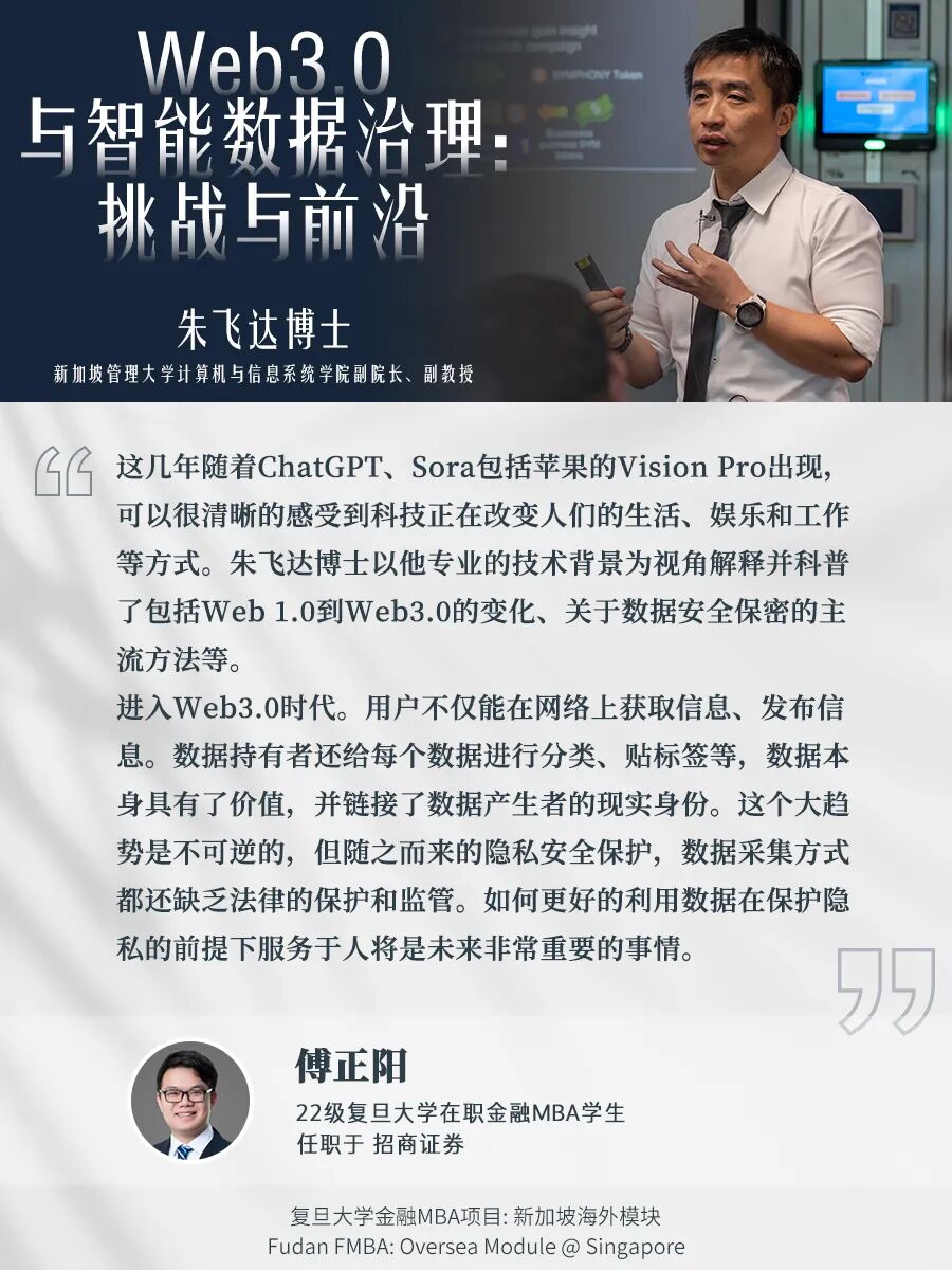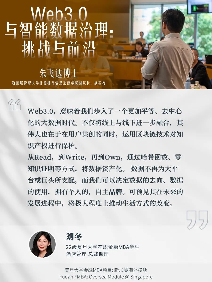 我们邀请到新加坡国立大学以及新加坡管理大学的顶级师资,为大家剖析全球化格局与变化、带大家了解Web3.0大数据时代之下金融科技的创新和应用;我们也走进新加坡金融管理局,看看新加坡是如何运用其金融监管体系为金融机构提供稳定的运营环境;除此之外我们也进一步探寻了金融服务业与家族办公室的本地化发展。