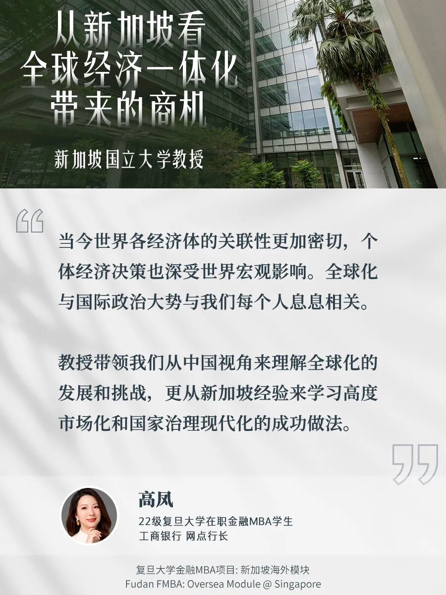 高凤 :当今世界各经济体的关联性更加密切,个体经济决策也深受世界宏观影响。全球化与国际政治大势与我们每个人息息相关。新加坡海外课程模块带领我们从中国视角来理解全球化的发展和挑战。当今世界面临两大挑战,一个是反全球化思潮;一个是国际地缘政治的分裂。全球地缘政治已经形成了一定的态势,经济全球化正在转向两个“半球化”的方向发展。