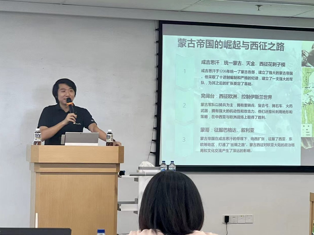 此外,袁弘旸同学分享了历史主题为“蒙古帝国的残影与世界历史的大转向”的内容,他向大家描绘了一个横跨亚欧大陆的蒙古帝国,并在此基础上,跟同学们科普了当今中俄伊的合作关系依然建立在蒙古帝国的残影之上的格局。他在讲述期间也是金句频出,为了纠正大家在蒙古帝国历史上的误区,他说:“蒙古当时是真的有海军司令的!”。这也揭示了历史的有趣性与复杂性。