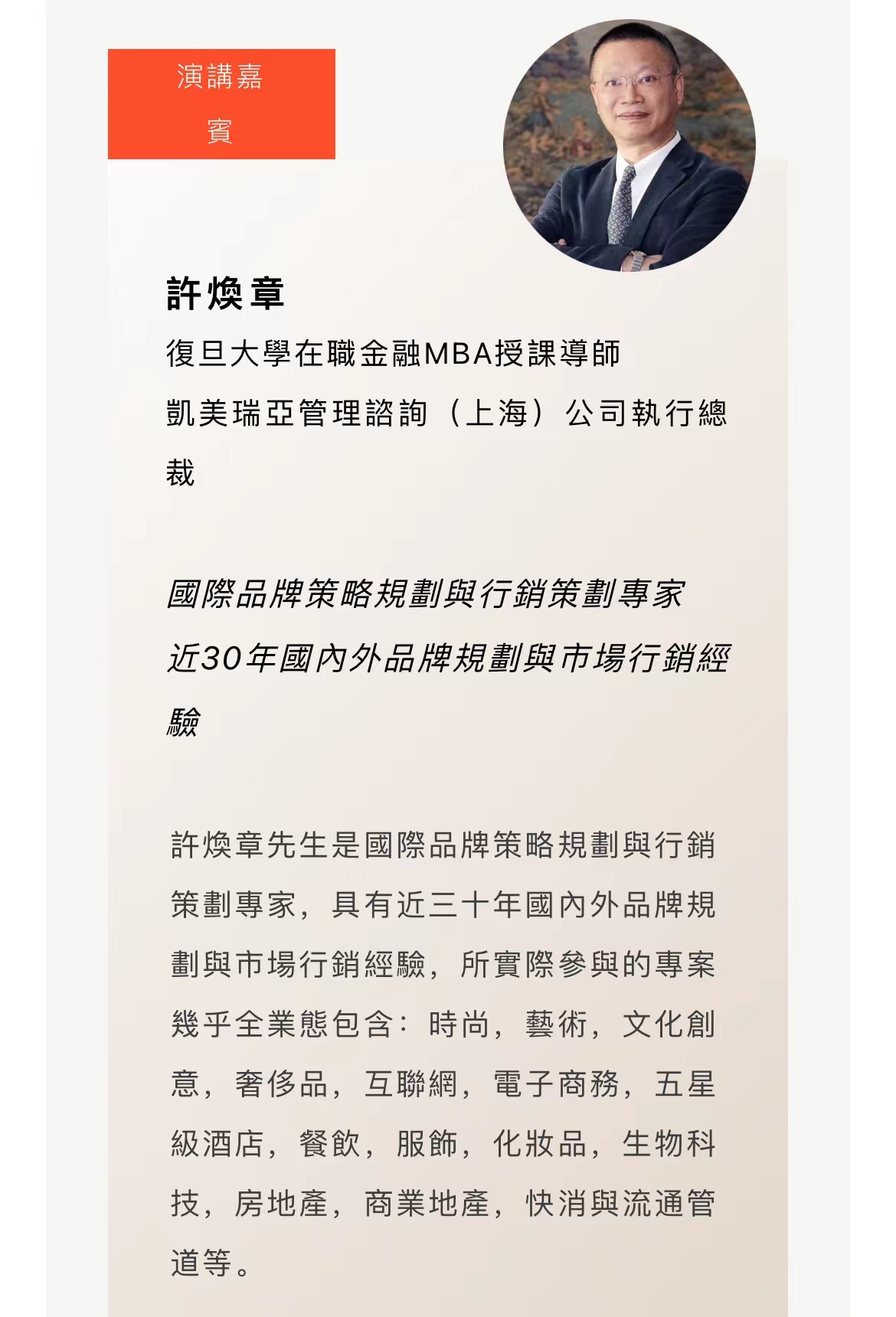 活动演讲人: 許煥章 復旦大學在職金融MBA授課導師,凱美瑞亞管理諮詢(上海)公司執行總裁