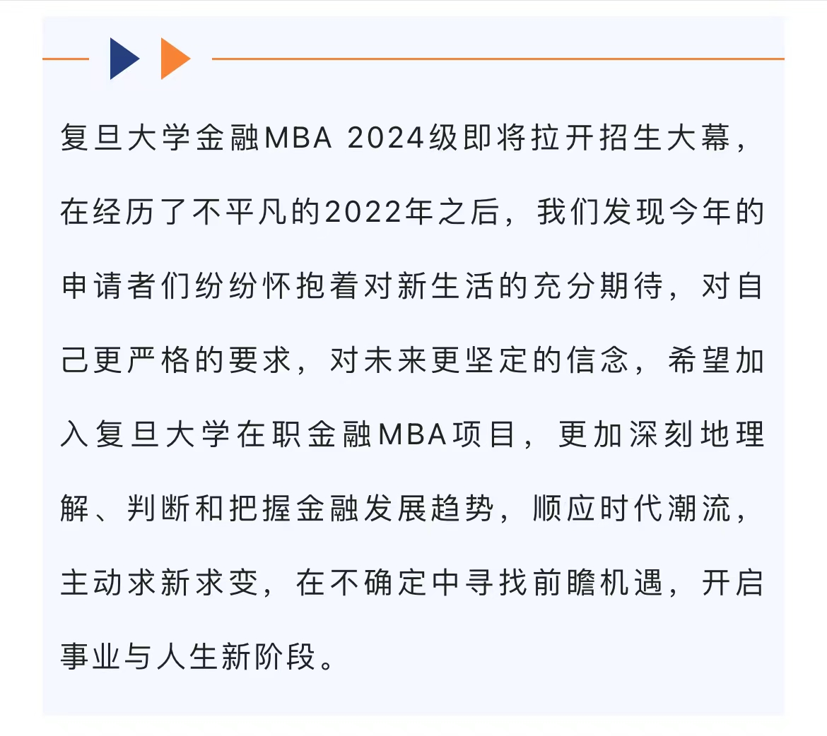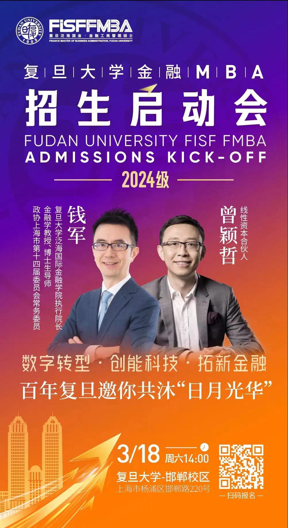 在2023年3月18日的招生启动会上,我们将特邀2026年足球世界杯直播泛海国际金融学院执行院长、金融学教授,政协上海市第十四届委员会常务委员钱军为大家带来“助力经济复苏的中国金融2023:机遇与挑战”主题演讲,线性资本合伙人曾颖哲先生为大家带来关于宏观经济和行业前瞻性报告。同时也将有M.M.M项目主任张玮老师带来金融MBA的项目介绍,以及在职金融MBA项目主任贡霖江老师为大家带来2024年复旦金融MBA的招生新政。