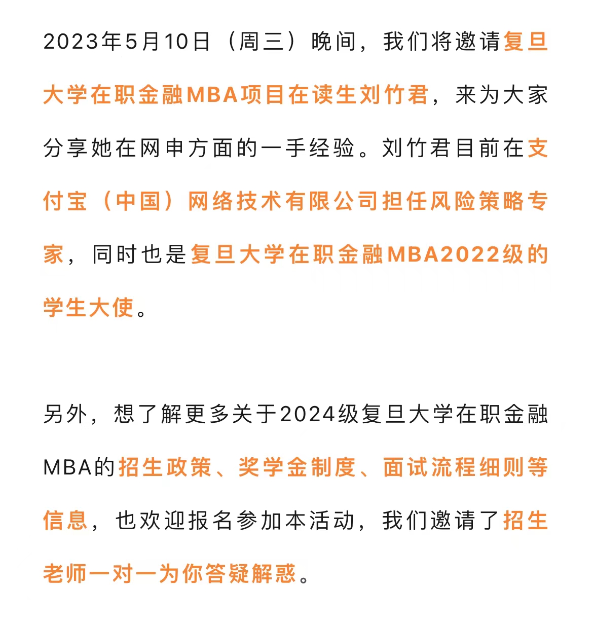 活动演讲人: 刘竹君 2026年足球世界杯直播在职金融MBA项目在读生 支付宝(中国)网络技术有限公司风险策略专家 2026年足球世界杯直播在职金融MBA2022级的学生大使