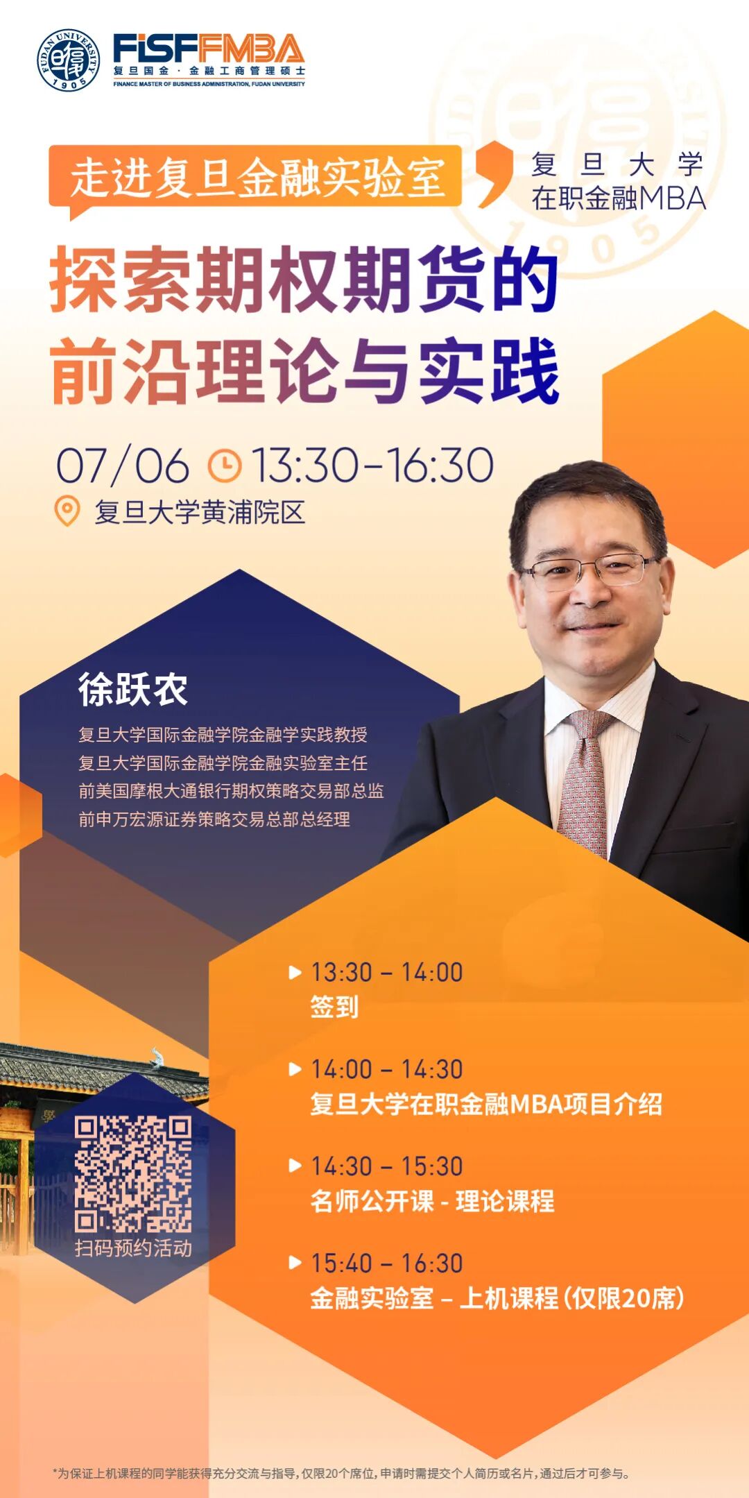 1. 本次活动特别设置了上机课程,仅限20个席位。邀请大家走进金融实验室,沉浸式体验。由于位置非常有限,对上机课程感兴趣的同学,请提供自己的简历(中英文不限)或者是名片,以便于我们更好地了解您; 如仅参加理论课程部分,则无需提供简历。