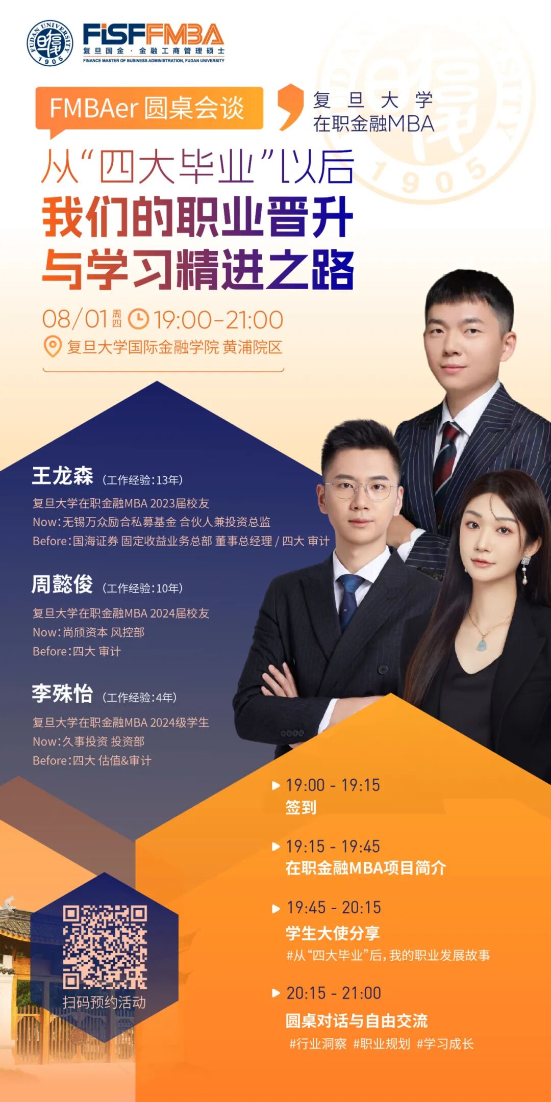 8月1日(周四)晚19:00,我们邀请到了工作近5年,10年和15年的三位复旦金融MBA学长姐,他们都曾经在四大挥洒汗水,如今在金融的各条线深耕。