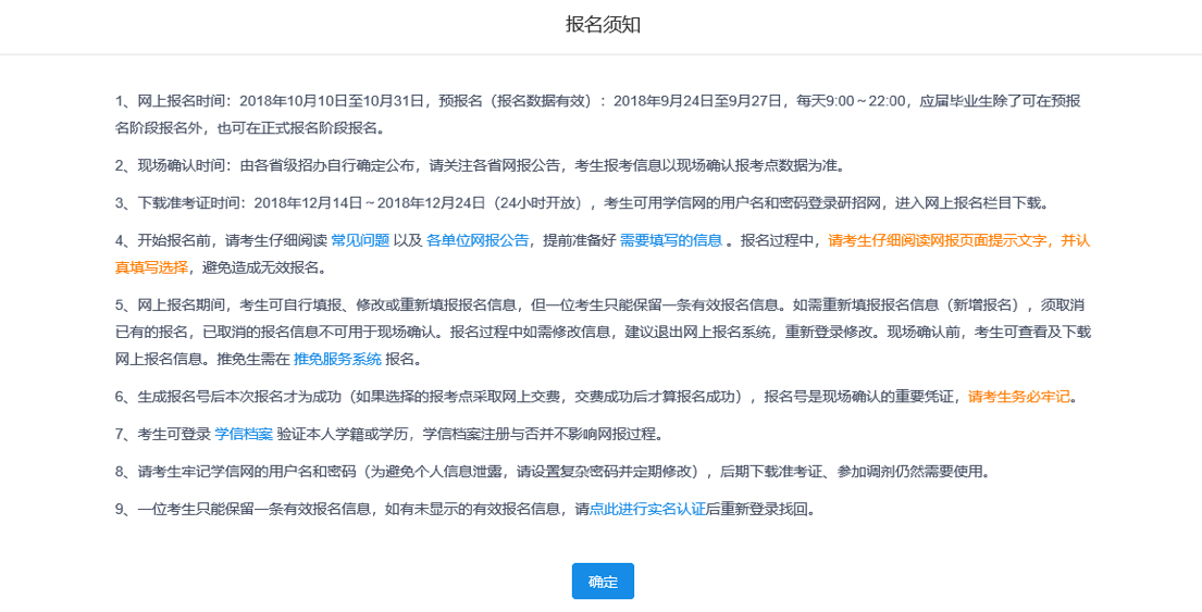 学生需在 “中国研究生招生信息网”(公网网址http://yz.chsi.com.cn,教育网址http://yz.chsi.cn,以下简称“研招网”)注册登录,在仔细阅读报名须知后认真填写考生信息。