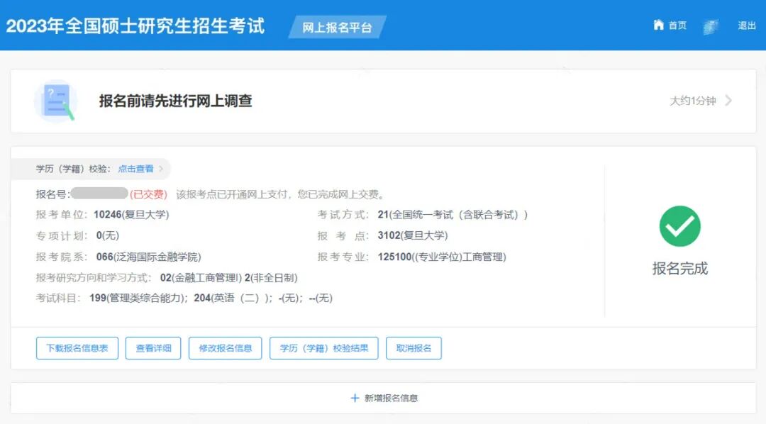 最后,校对所有已填报的信息确认无误后,生成考生报名号,并下载报名信息表。