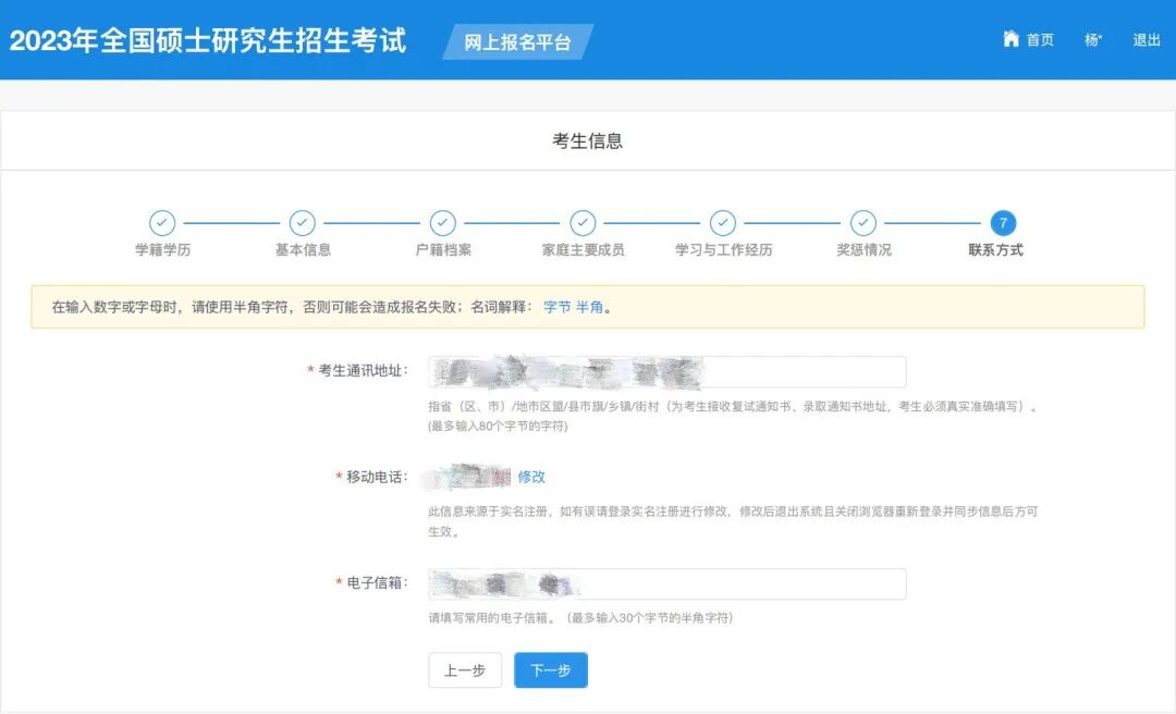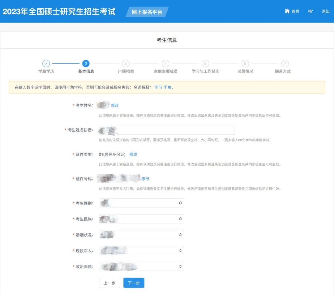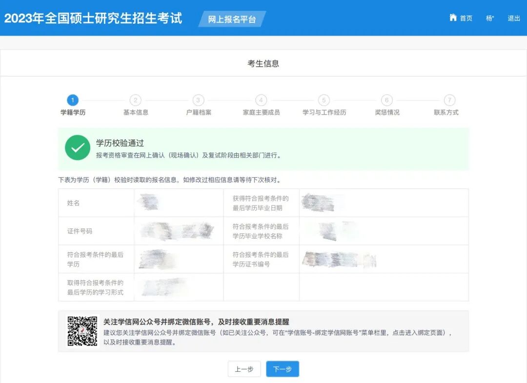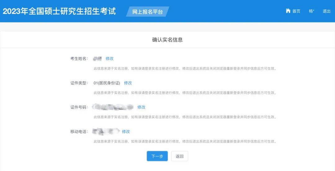 确认“实名信息”(此信息来源于学信网实名注册信息,需仔细核对),点击“下一步”。
