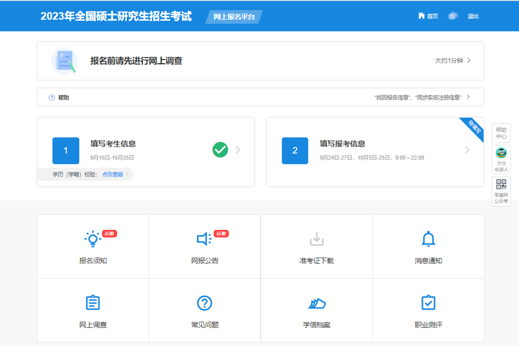 必须先完成“1.填写考生信息”(如上图所示),才能进入“2.填写报考信息”;