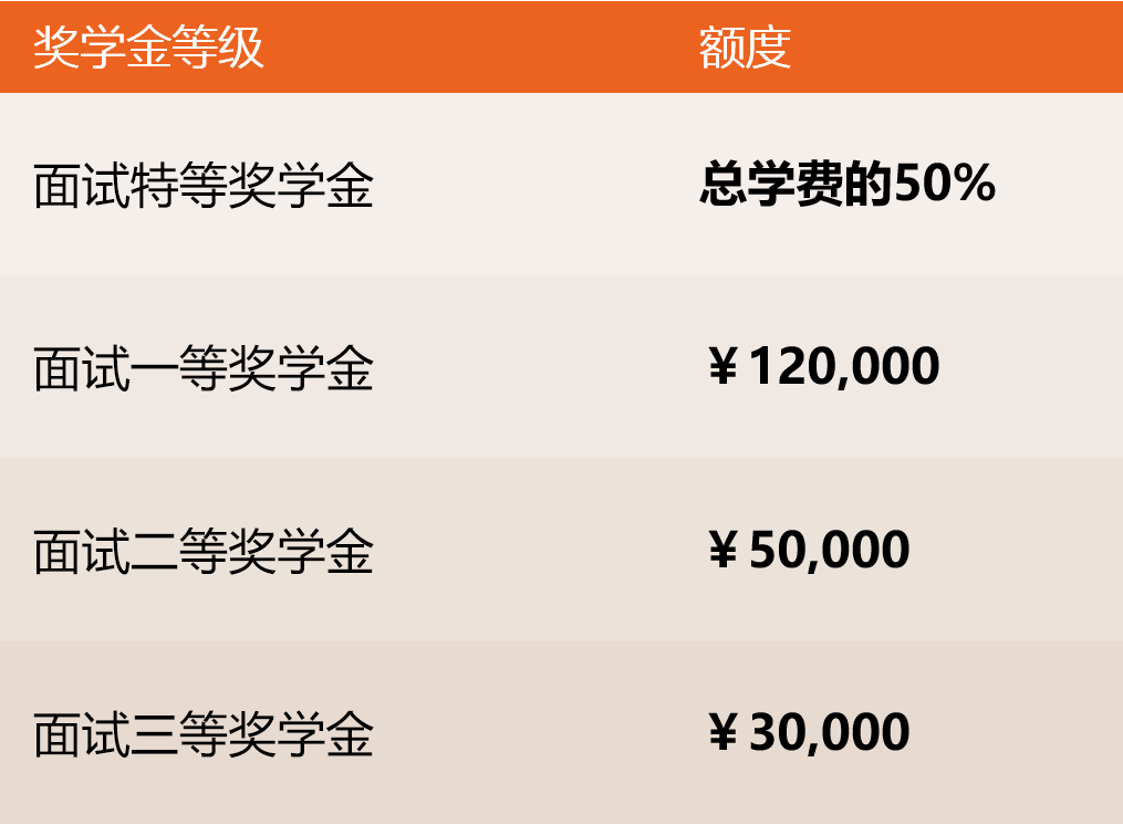 根据往年经验,预审面试奖学金覆盖率高达80%,特等奖学金金额高达总学费的50% (¥269,000)!依据背景和面试的综合表现,入学前即可知道结果!