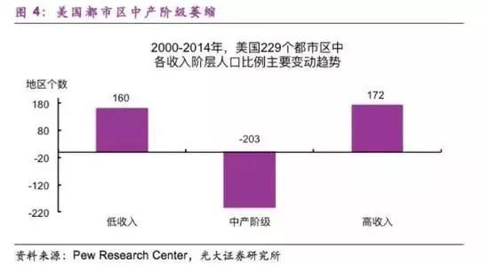 从结构来讲,美国国内的一些问题更突出。首先,从美国的都市区社会阶层分化来看,美国都市区中产阶级的人数在下降,而两端的低收入和高收入人口比例在上升,社会阶层分化越来越严重。