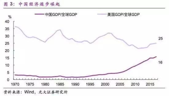 中美贸易不平衡相对于中国经济规模来讲有明显的下降,但对美国来讲,贸易不平衡并没有降低,对中国而言问题较小,而对于美国而言这仍然是个大问题。这反映了两国经济相对地位的变化。从中美GDP占全球GDP的比例来看,美国虽然有美元汇率的波动带来上下的波动,但趋势上总体是下行,而中国是往上的,差别越来越小,这是从总量看相对地位的变化。