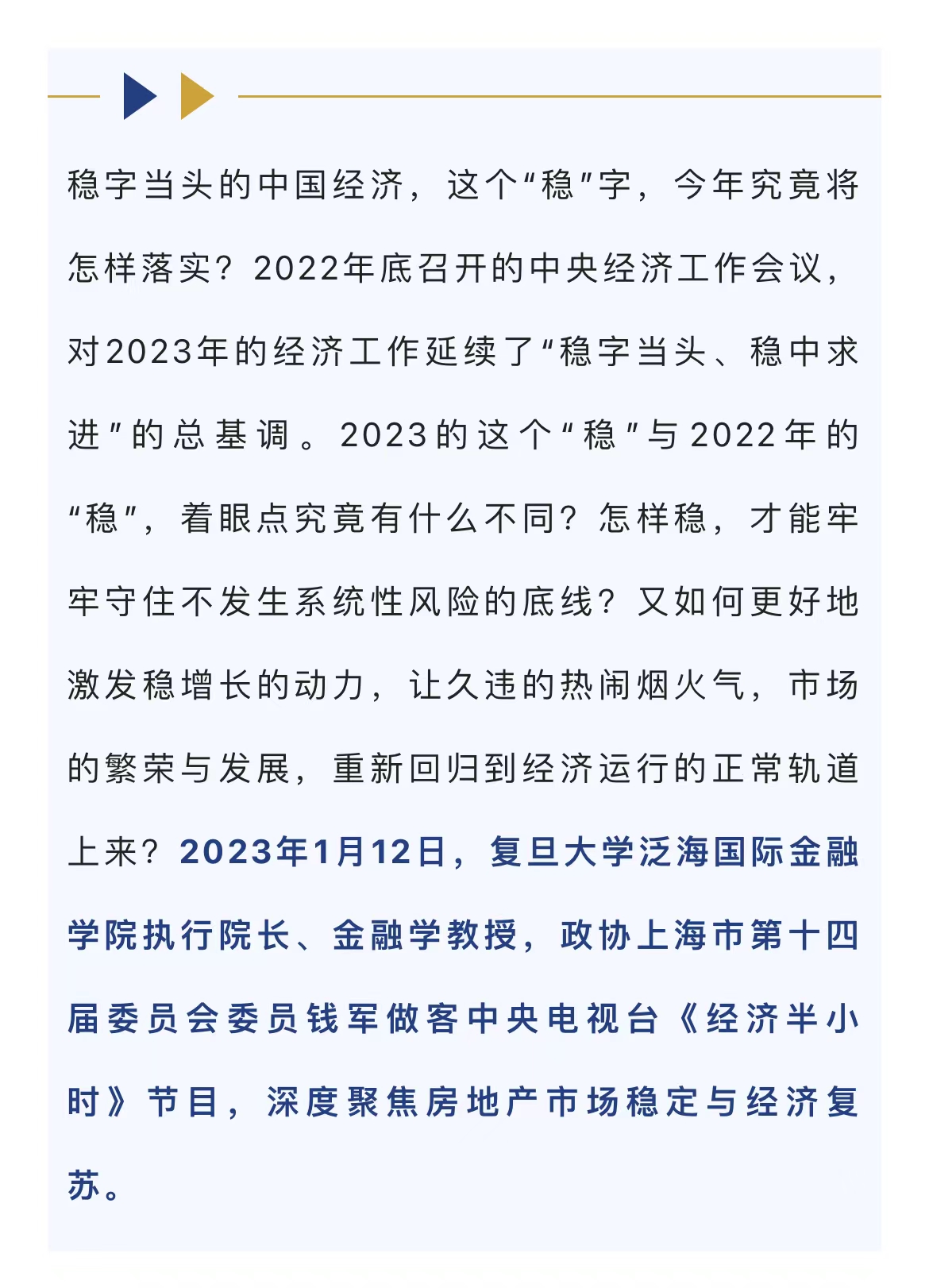 钱军教授做客中央电视台《经济半小时》节目,深度聚焦房地产市场稳定与经济复苏